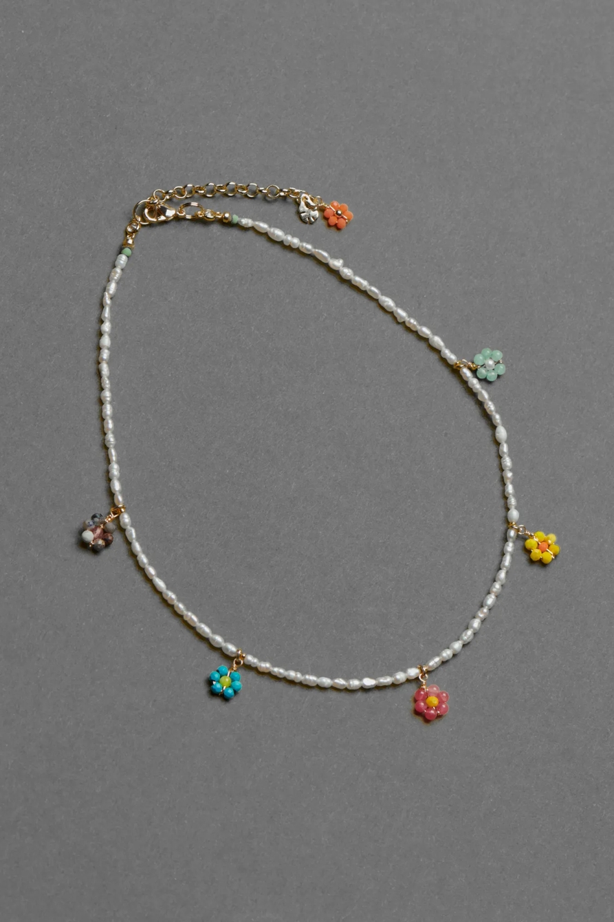 beaded flower charm pearl necklace