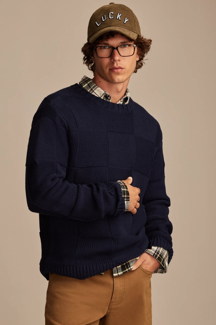 check stitch crew neck sweater