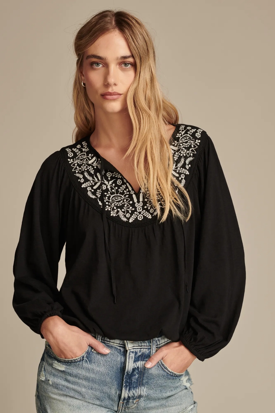 contrast embroidered peasant top