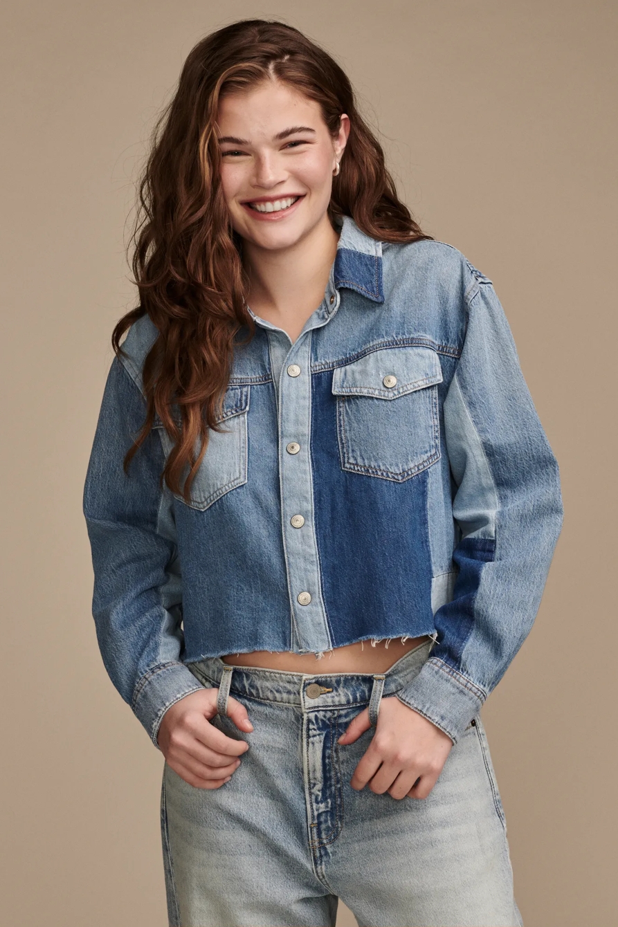 denim patchwork button down shirt