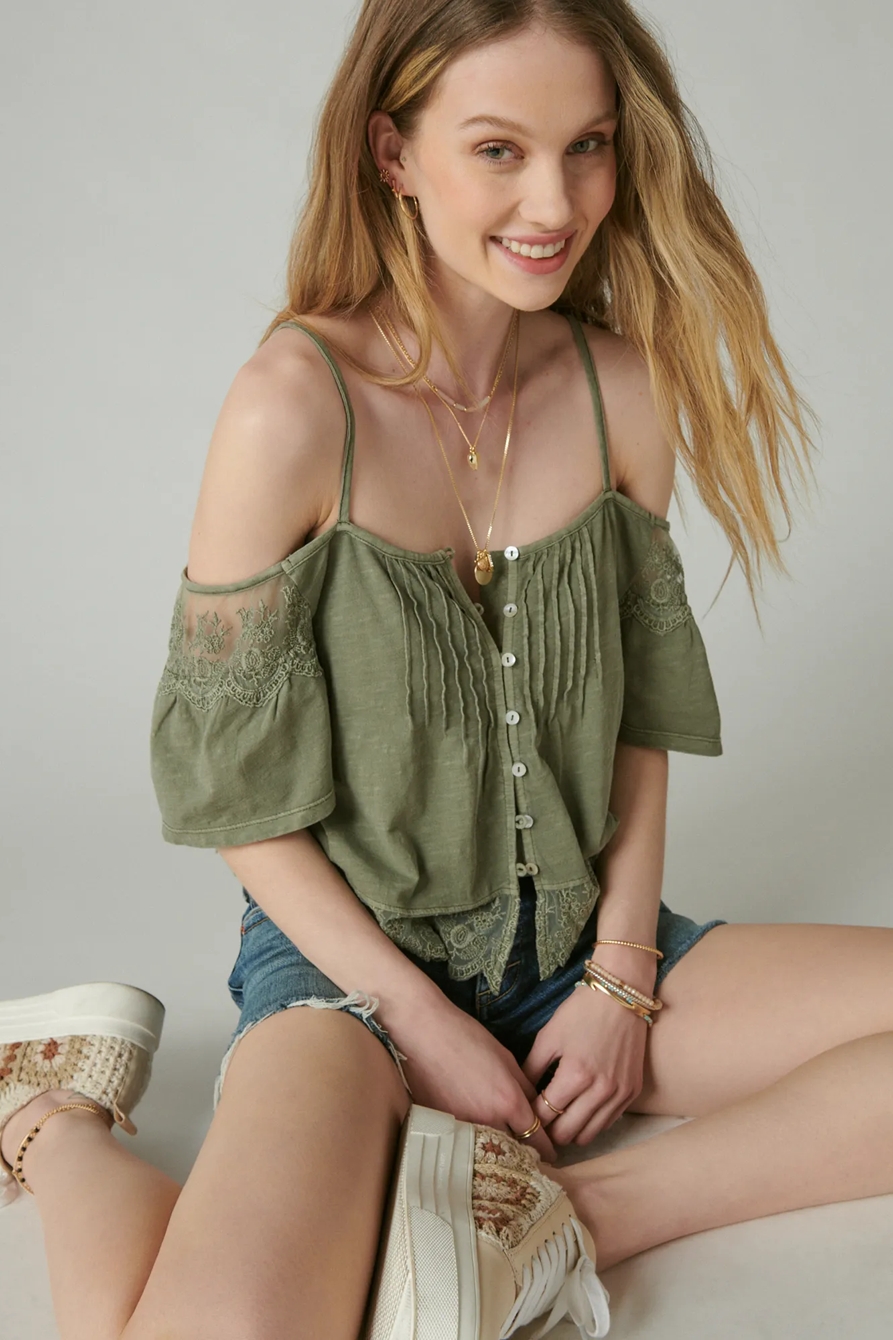emboidered lace cold shoulder top
