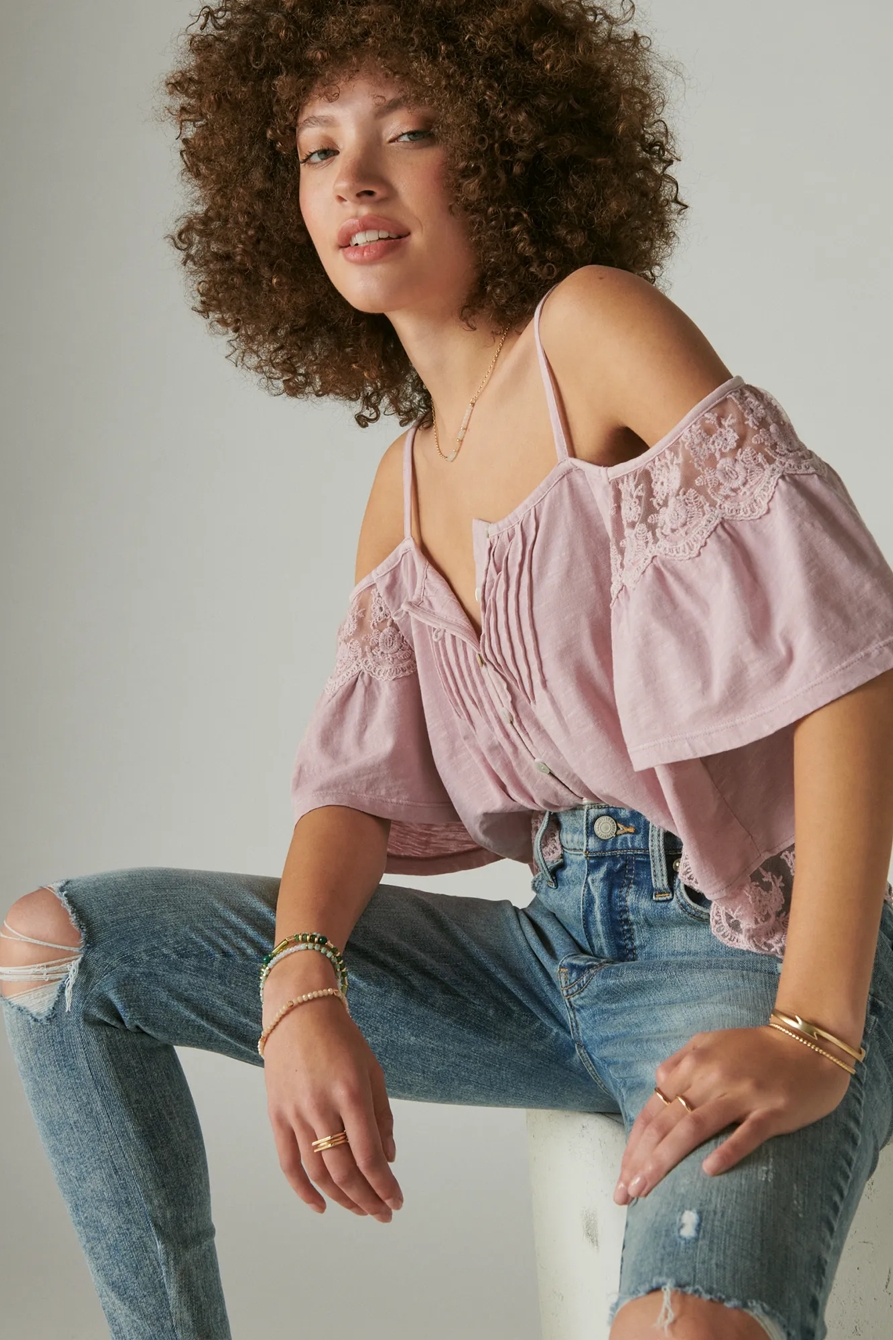 emboidered lace cold shoulder top