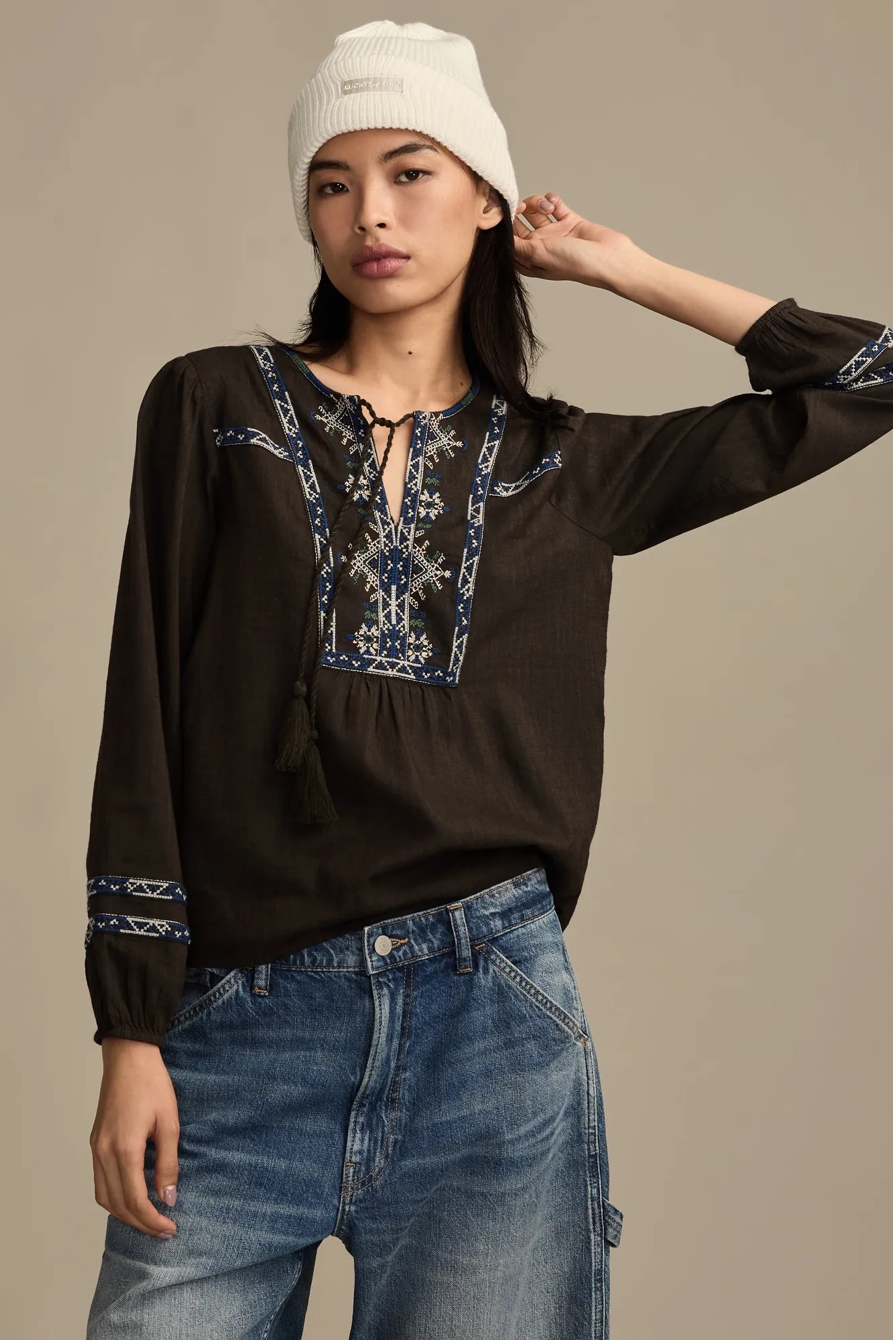 embroidered notch neck peasant top