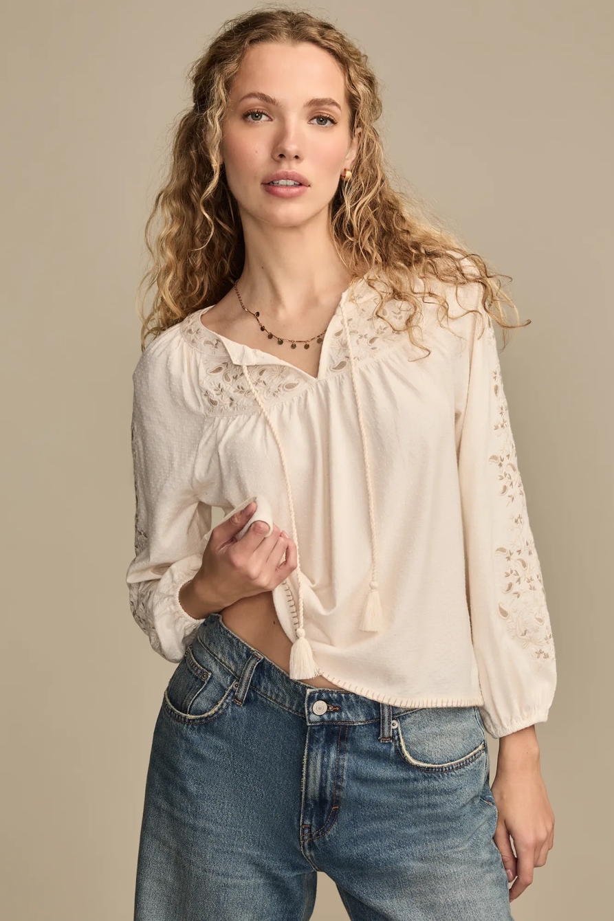 embroidered notch neck peasant top