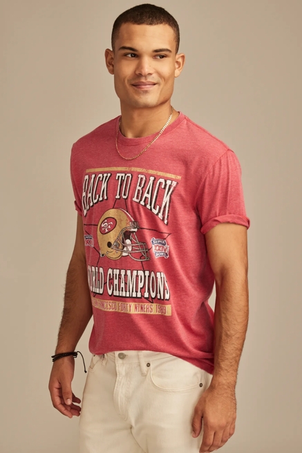 Lucky Brand's sports graphic tees showcase authentic team spirit with carefully crafted designs that capture the essence of each sport. From retro football helmet graphics to dynamic basketball action shots, tennis racquet motifs, and pickleball paddle designs, every tee tells a story. Made with our signature attention to detail, these shirts feature distressed prints and vintage washes that give them a lived-in, comfortable feel right from the first wear.