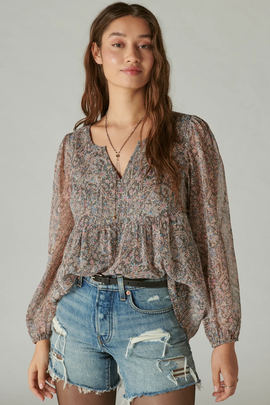 open neck printed peasant top