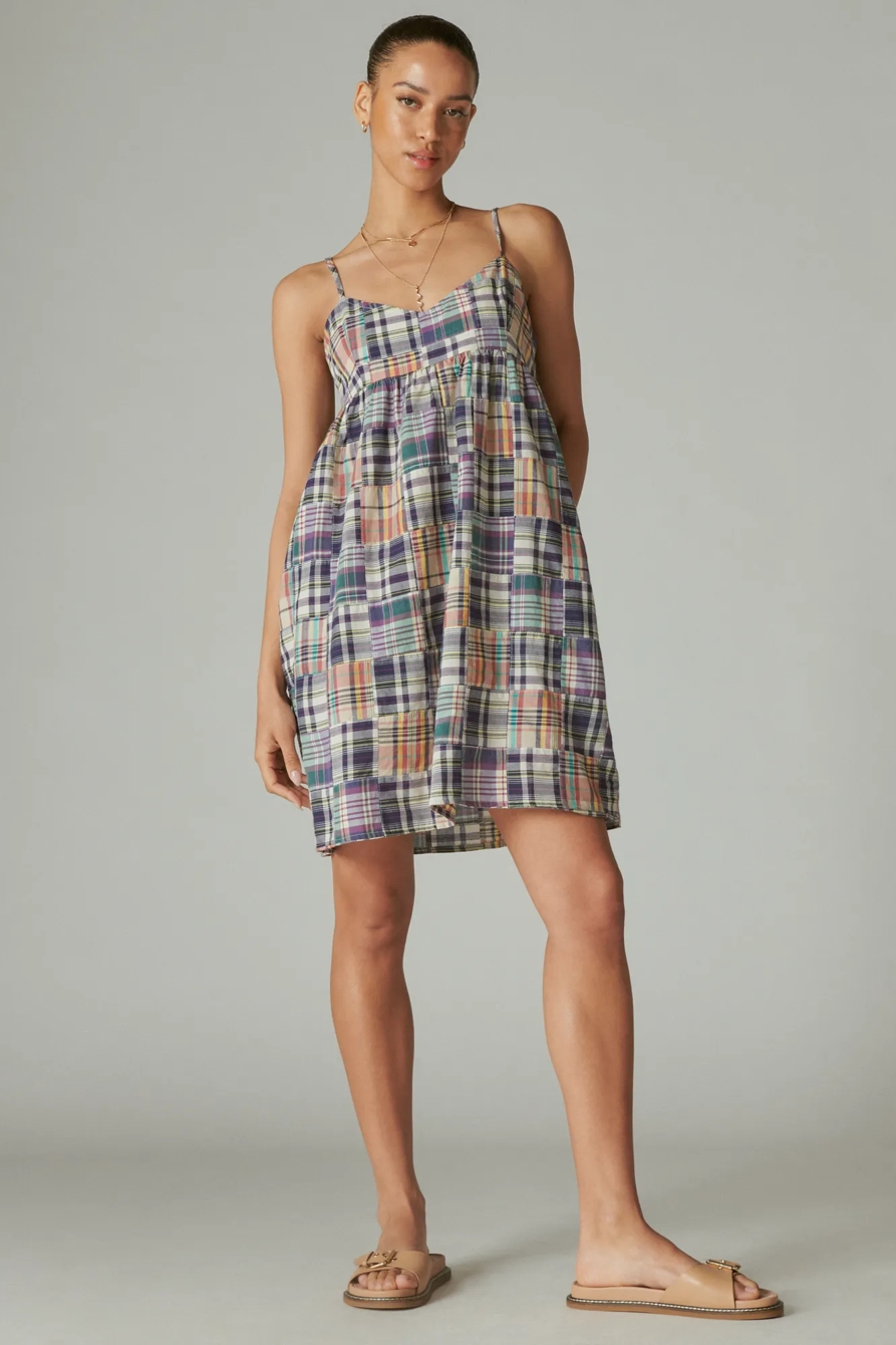 patchwork madras babydoll mini dress