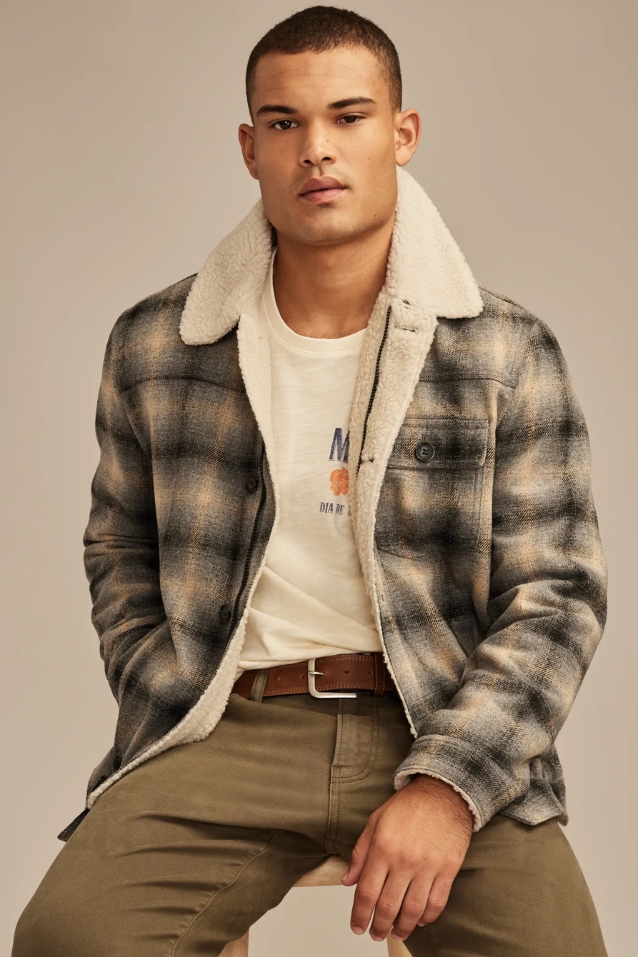 plaid faux shearling lined trucker jacket