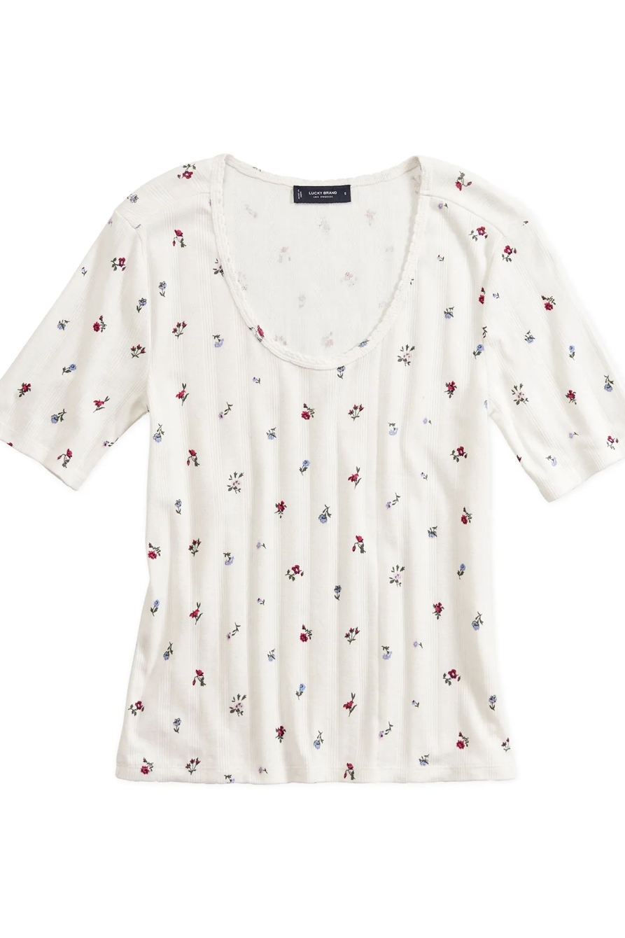 printed pointelle scoop neck tee