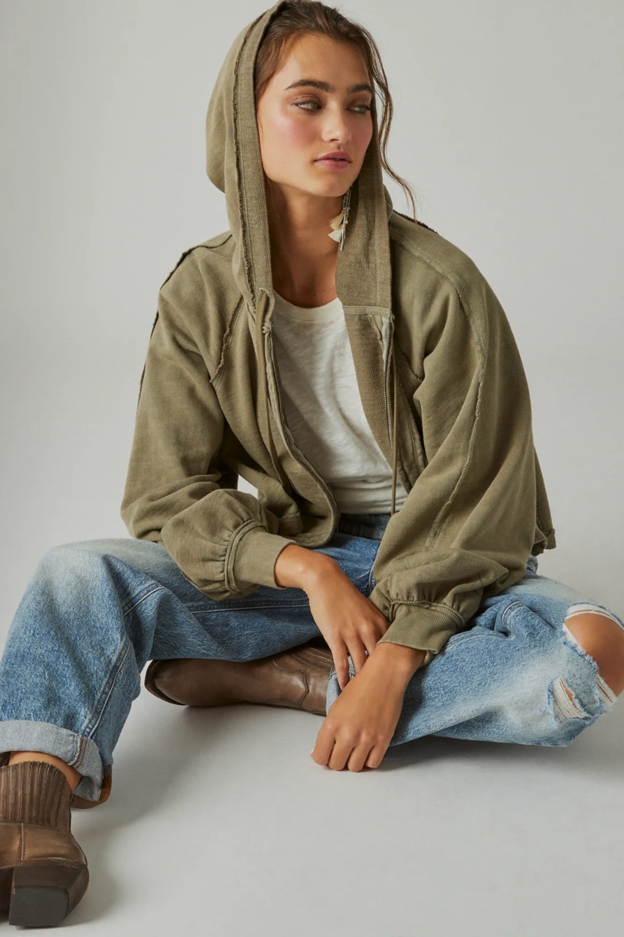 raglan raw edge zip up hoodie