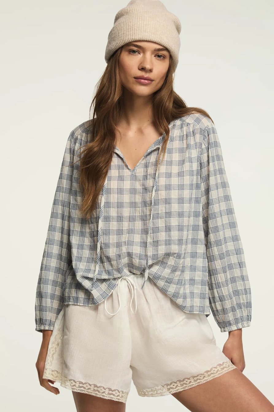 shirred flowy plaid shirt