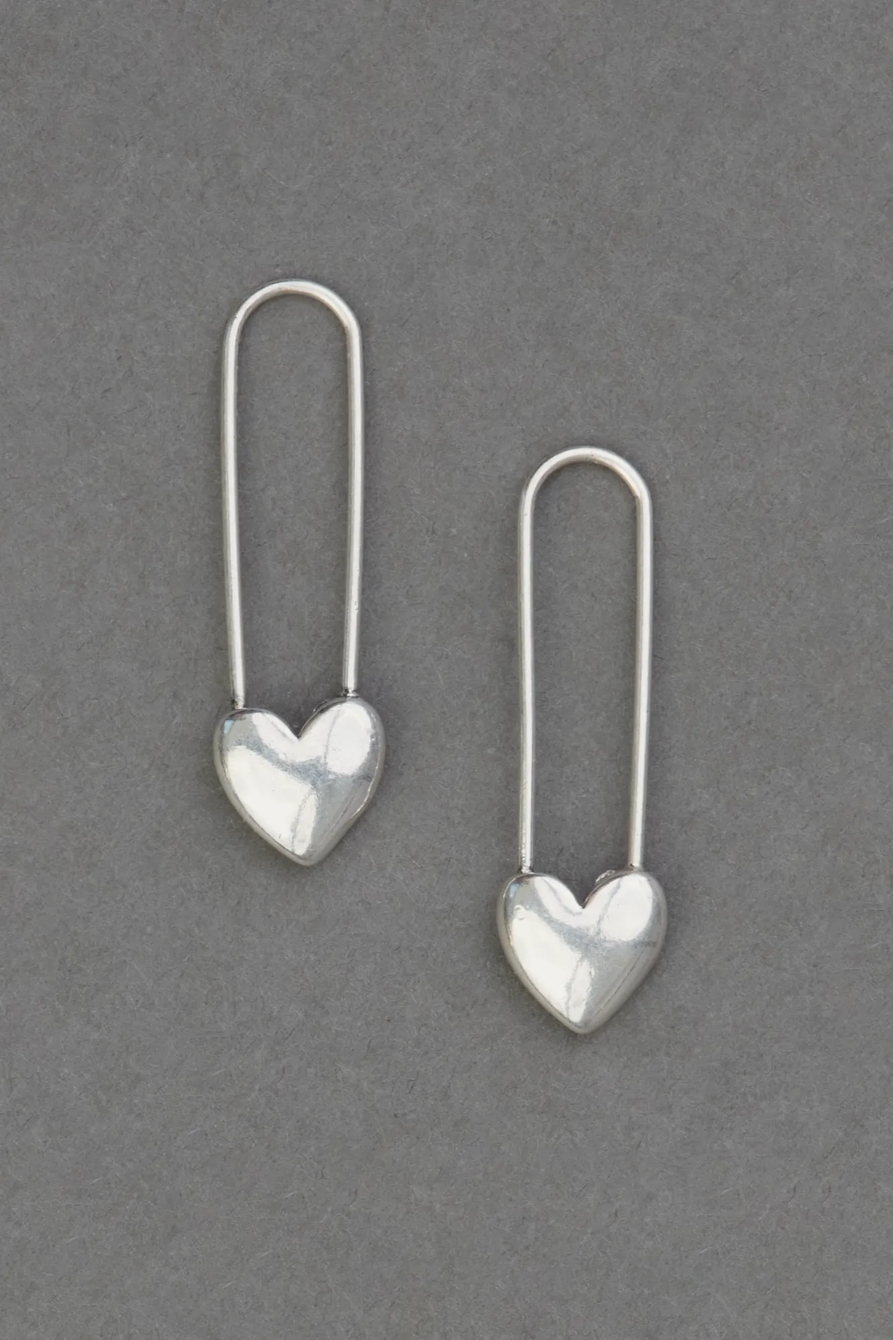 silver safety pin heart earrings