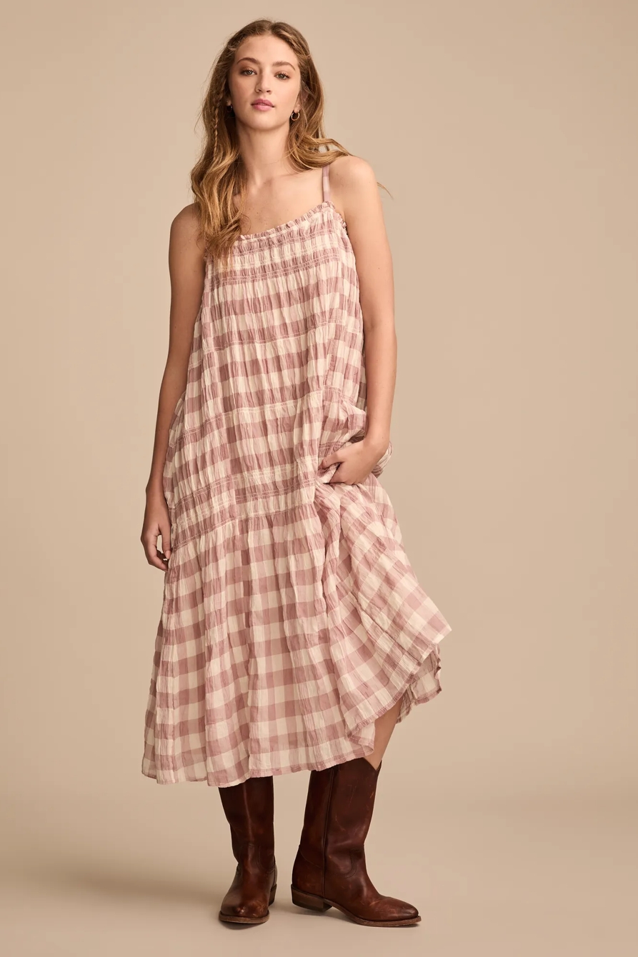 smocked gingham midi dress