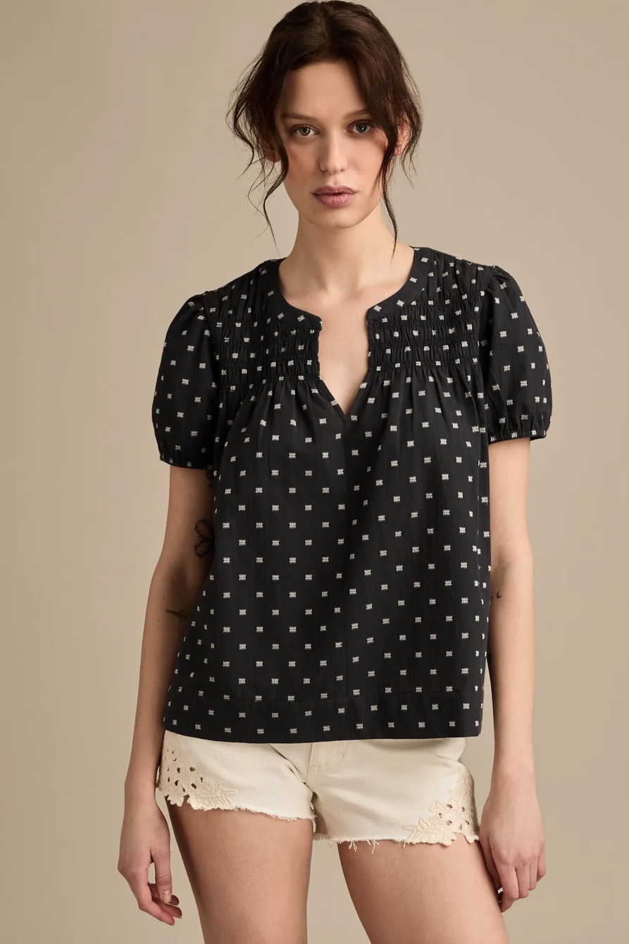 smocked notch neck puff sleeve top