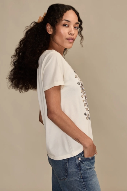 Discover Lucky Brand's collection of women's floral graphic tees that capture the free-spirited essence of vintage Americana. Our flower-inspired designs feature hand-drawn botanical prints, delicate rose motifs, and vibrant wildflower graphics that bring natural beauty to your everyday wardrobe. Each tee is crafted with soft, comfortable fabrics that feel as good as they look, making them perfect for layering under denim jackets or wearing solo on warm summer days.