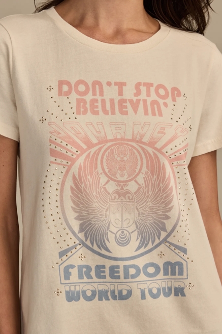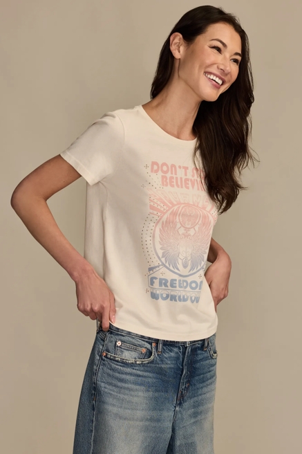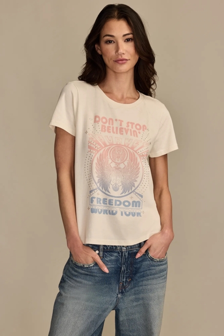 Go beyond basic casual looks with the fresh new collection of women's graphic tees now in stock at Lucky Brand. The best graphic shirts give you outstanding flexibility for everyday wear. These tees are a great choice as a primary top, but can also be layered with pieces such as vests and button-down shirts for added visual appeal. Complete these combinations with a pair of Lucky Brand jeans, and low profile canvas sneakers in a complementary shade to round out this weekend look. These tees can also accentuate polished outfits. Pair a vibrant graphic tee with a pair of chinos to make it the centerpiece of your look. Show off a peek of your personal style with a cute midi skirt and one of these shirts tucked under a cardigan. These versatile pieces can even be dressed up for a casual Friday or working lunch, worn beneath a blazer to give the ensemble a more professional feel. Top it off with a pair of heels to make a bold and confident statement. Explore the possibilities already in your closet by adding Lucky Brand graphic women's t-shirts to your regular rotation.
